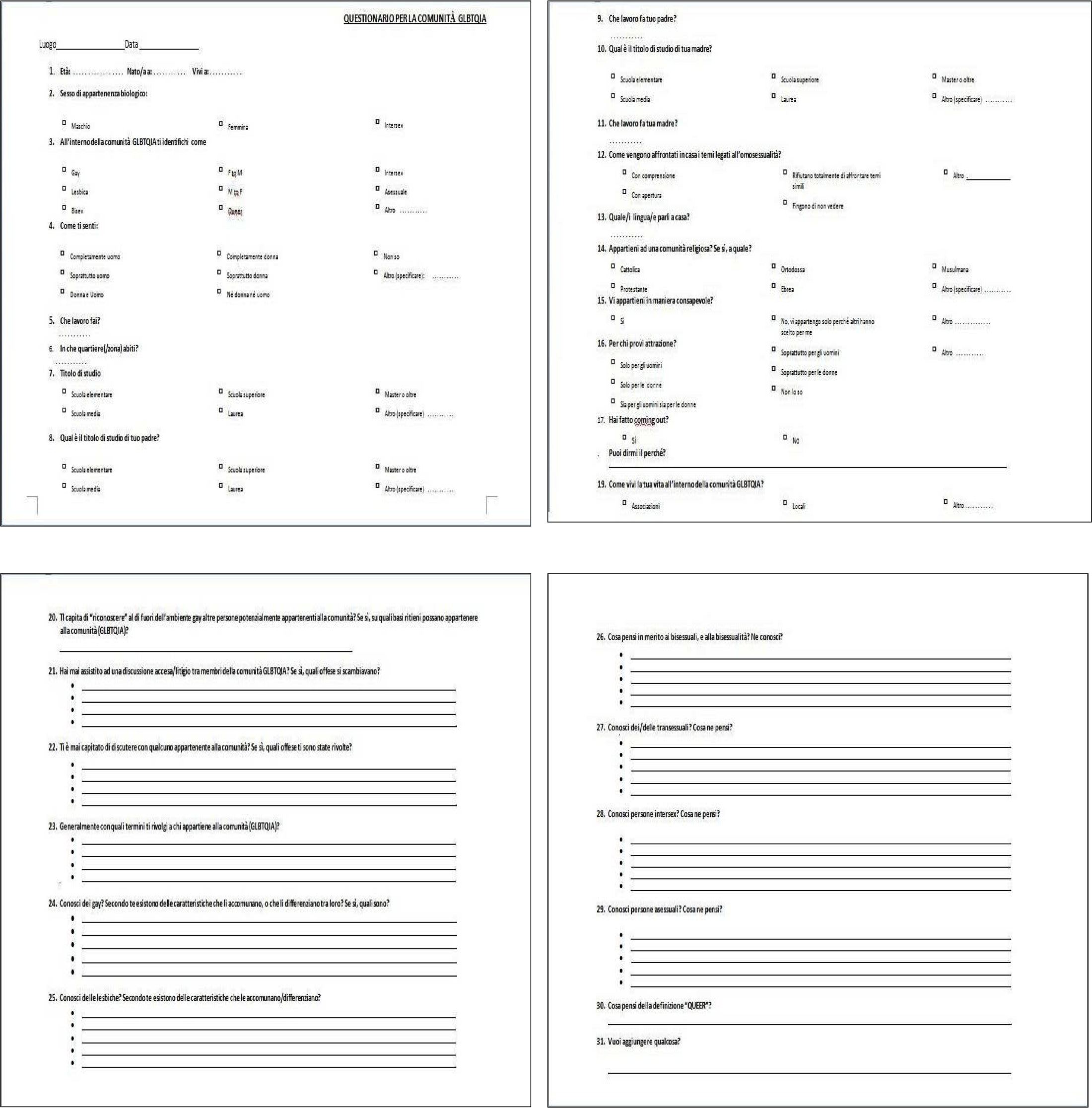 Nato da una ricerca sul campo che ha previsto la raccolta di 200 interviste (in parte anche registrate) all’interno di luoghi selezionati della comunità GLBTQIA di Roma (raccolta avvenuta nel periodo maggio 2012 – dicembre 2013, in principio finalizzata alla costituzione del corpus di una tesi in linguistica e sociolinguistica), lo studio offre una sintesi dell’analisi ottenuta dallo spoglio delle risposte fornite dagli intervistati ai questionari semistrutturati loro proposti.